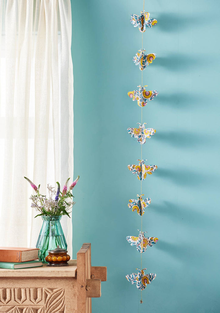 From an exciting range of eco friendly, recycled decorations entirely hand crafted in beautiful block print designs of bold colour. Both sides of the bee vertical garland display a dramatic sunflower pattern. Eight three dimensional bees are attached by a thin gold thread running through the centre of each and completed by a small silver coloured metal bee decoration at the base of the garland. Suitable for all kinds of celebration and creating funky room designs.