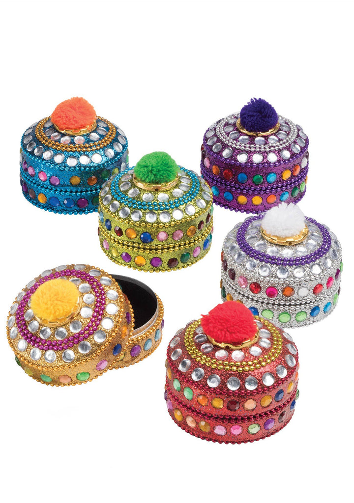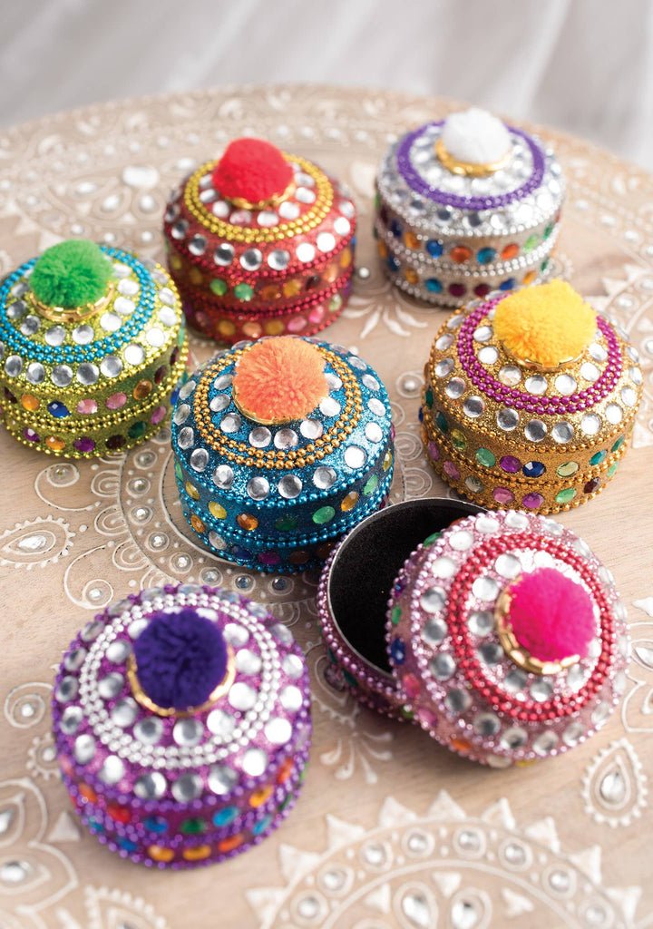 Vibrant, fun, and covered in so much glitter and jewels that we love them! These glitter and pom pom boxes are perfect for keeping those little trinkets in.
