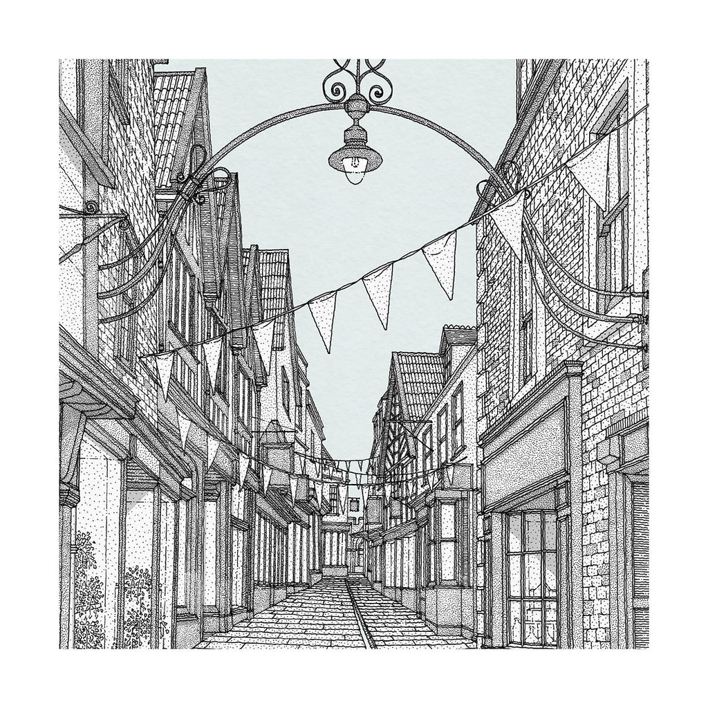 The hand drawn perspective captures the delightful Medieval Cheap Street in Frome. A single block of colour amplifies the articulated roof form and delicate ironwork over the street. The colour extends to the small leat celebrating the water that flows from the stream beneath St John’s Church. The limited-edition architectural illustration is signed, numbered and dated.