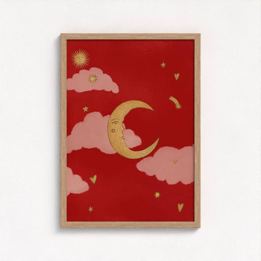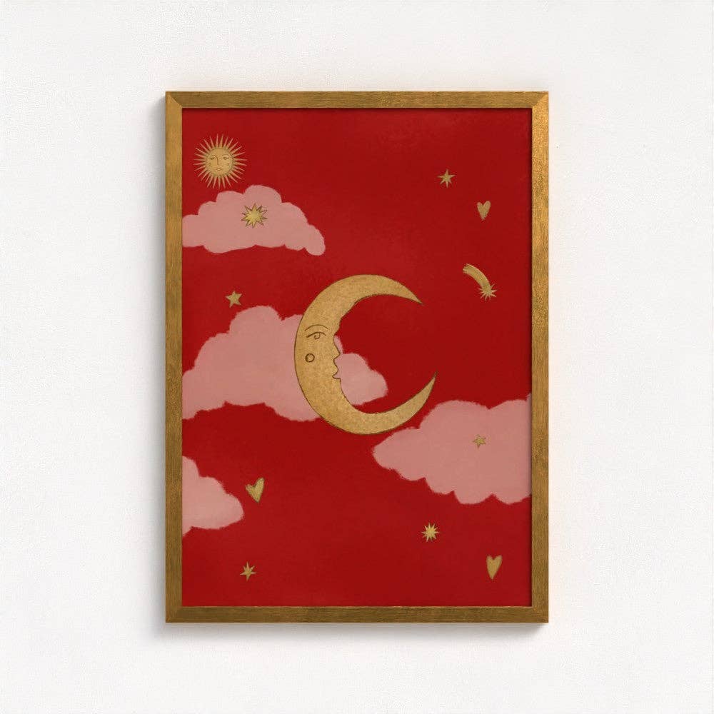 Illuminate your space with the radiant allure of the La Lune Folk-Vintage Maximal Sun and Moon Art Print in Red & Gold, hand-illustrated by Queen of the Rodeo.